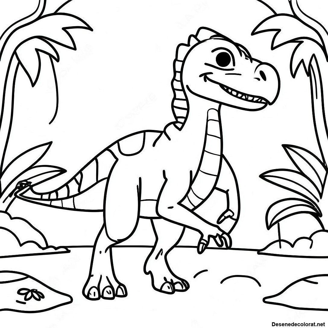 Pagini de colorat cu un T Rex fericit jucându-se cu prietenii