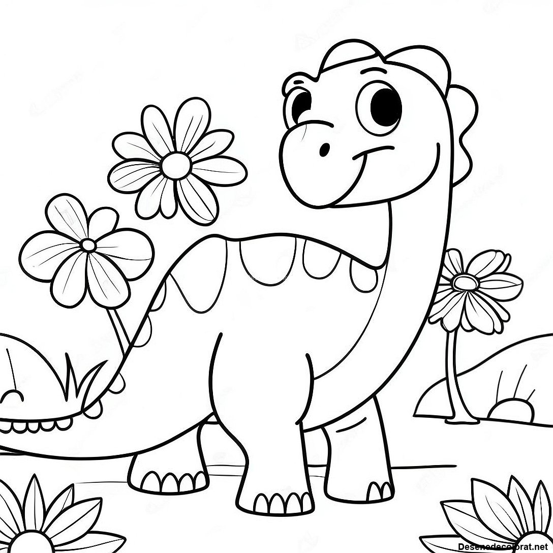 Pagini De Colorat Cu Brontosaurus Fericit Si Flori